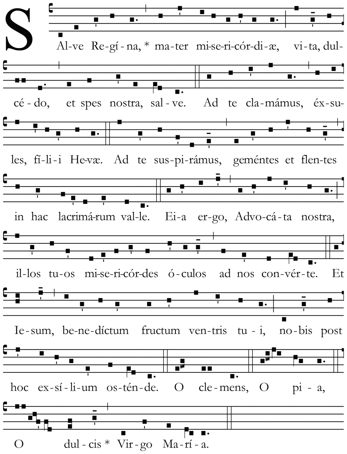 Salve, Regína, mater misericórdiæ, vita, dulcédo, et spes nostra, salve. Ad te clamámus éxsules fílii Hevæ. Ad te suspirámus, gementes et flentes in hac lacrimárum valle. Eia ergo, Advocáta nostra, illos tuos misericórdes óculos ad nos convérte. Et Iesum, benedíctum fructum ventris tui, nobis post hoc exsílium osténde. O clemens, O pia, O dulcis Virgo María.