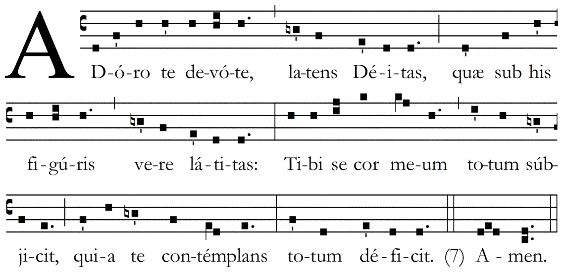 1 Adoro te devote, latens Deitas, quæ sub his figuris vere latitas: Tibi se cor meum totum subjicit, quia te contemplans totum deficit.