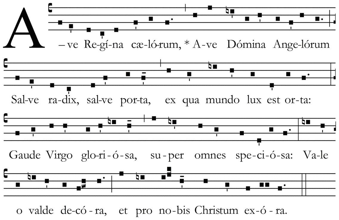Ave Regina cælorum, * Ave Domina Angelorum Salve radix, salve porta, ex qua mundo lux et orta: Gaude Virgo gloriosa, super omnes speciosa: Vale o valde decora, et pro nobis Christum exora.
