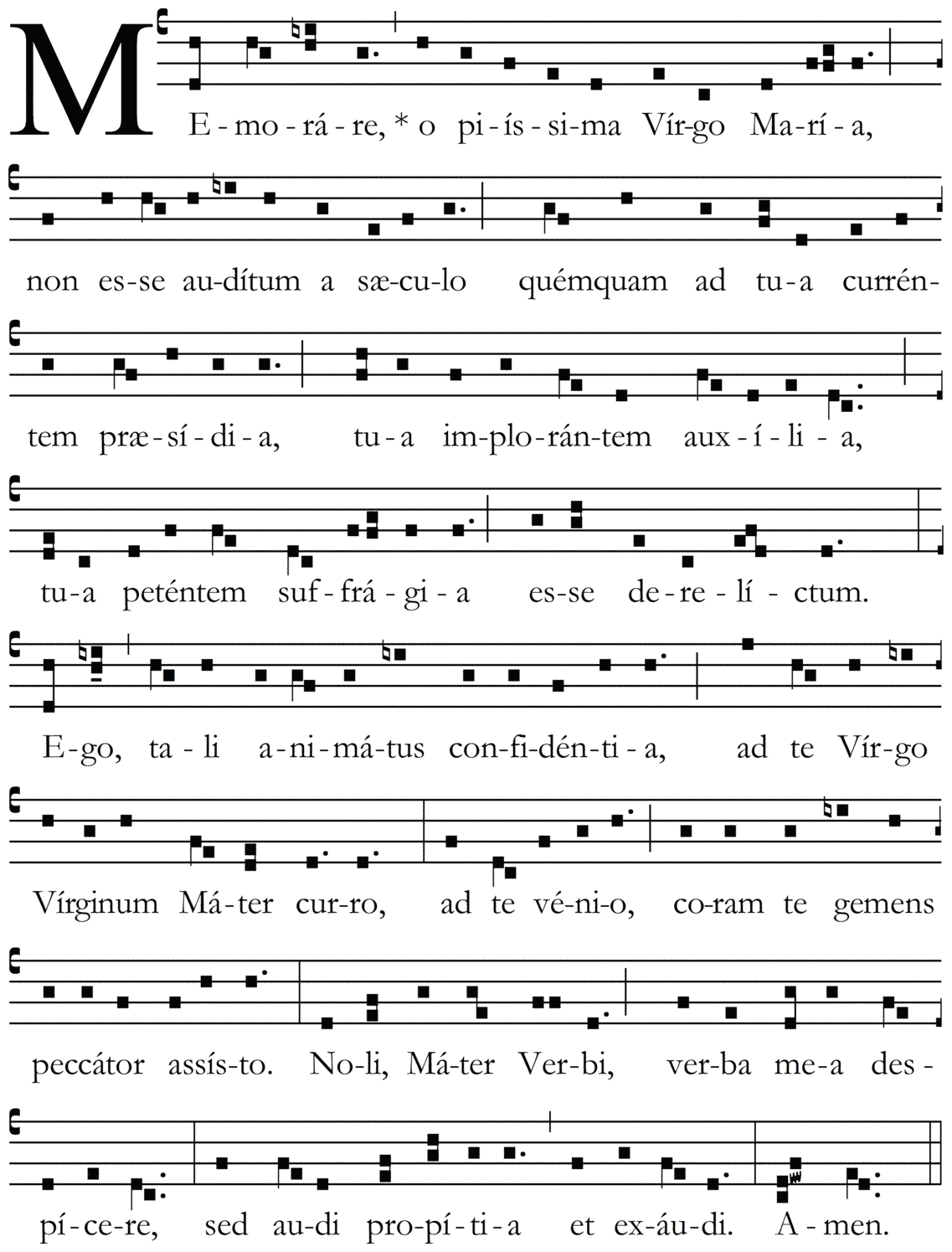 Memorare, * o piissima Virgo Maria, non esse auditum a sæculo quem quam ad tua currentem præsidia, tua implorantem auxilia, tua petentem suffragia esse derelictum. Ego, tali animatus confidentia, ad te Virgo Virginum Mater curro, ad te venio, coram te gemens peccator assisto. Noli, Mater Verbi verba mea despicere, sed audi propitia et exaudi. Amen.
