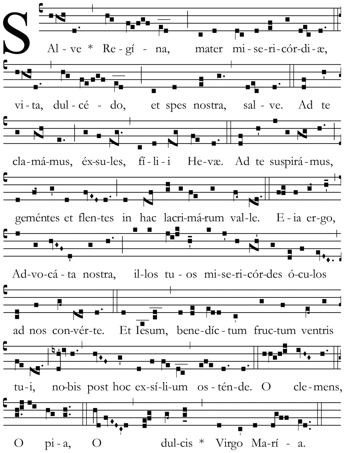 Salve, Regína, mater misericórdiæ, vita, dulcédo, et spes nostra, salve. Ad te clamámus éxsules fílii Hevæ. Ad te suspirámus, gementes et flentes in hac lacrimárum valle. Eia ergo, Advocáta nostra, illos tuos misericórdes óculos ad nos convérte. Et Iesum, benedíctum fructum ventris tui, nobis post hoc exsílium osténde. O clemens, O pia, O dulcis Virgo María.